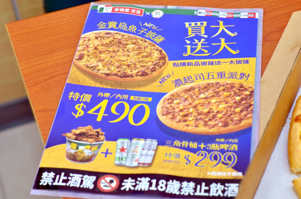 新推出兩款超誘人的大披薩:「金賞烏魚子披薩」跟「濃起司五重派對」,而且 8/11~9/3 活動期間,買大披薩直接送一個大披薩,最高可以省 490 元,超適合揪朋友或家人一起分。