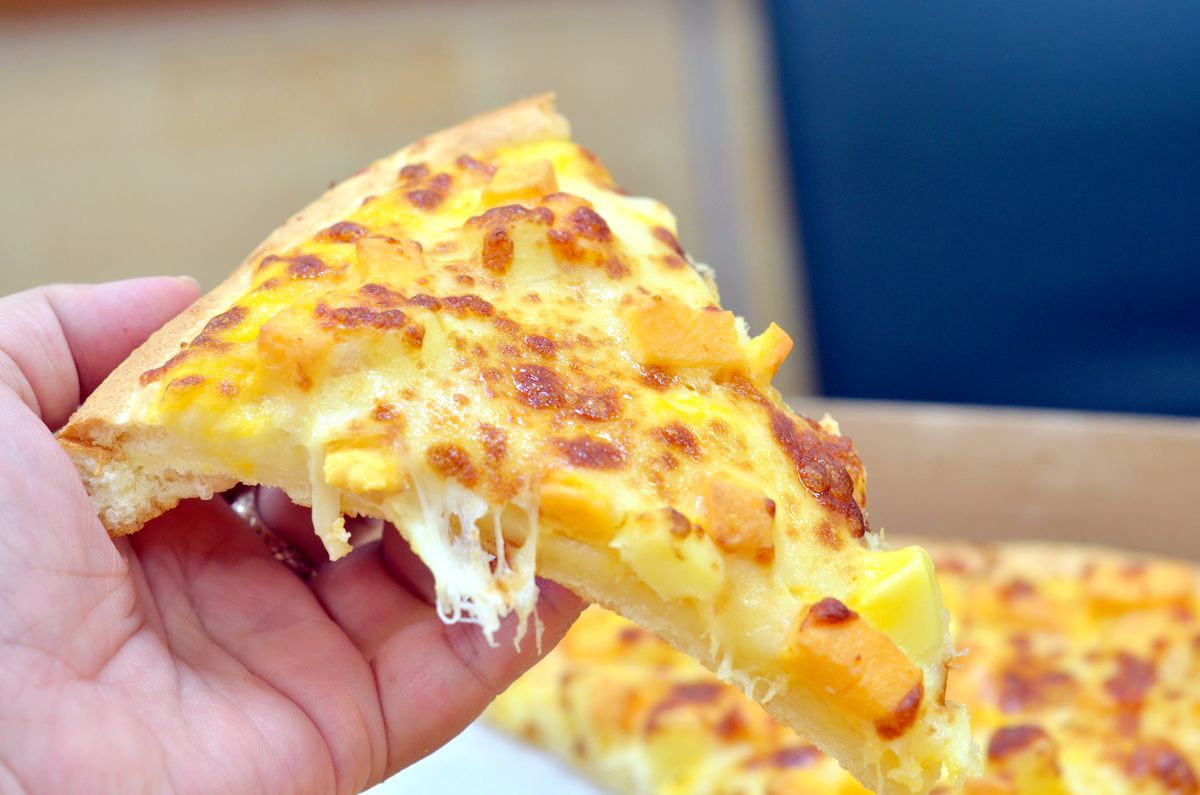 香氣四溢濃郁不膩,一口接一口的起司牽絲,讓人停不下來!吃貨小隊覺得整體的口味是稍微偏甜,喜歡甜鹹甜鹹的吃貨們可以選這個。