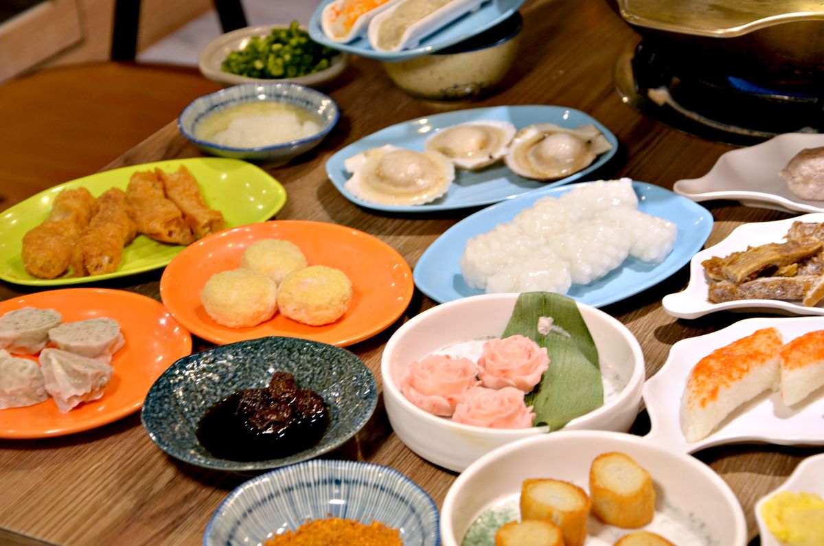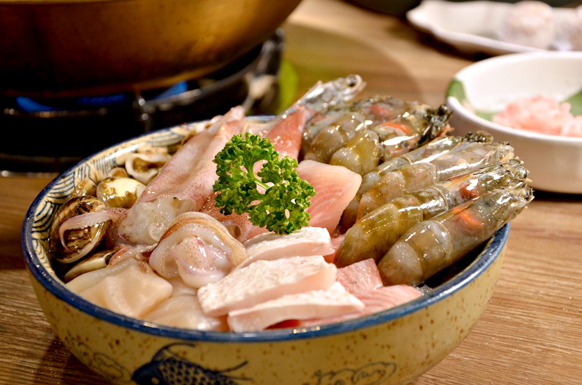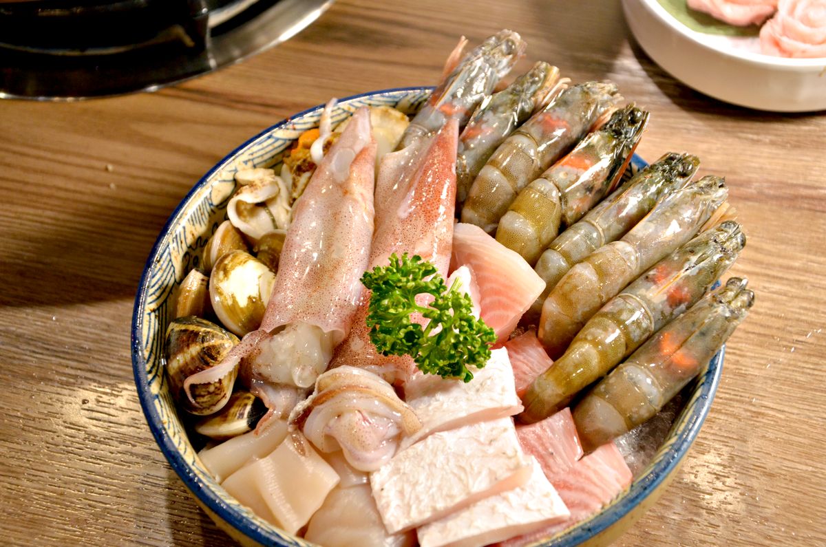 海鮮盤送上來的時候有嚇到,因為種類真的豐富,擺滿了鯛魚、鱸魚、帆立貝、小卷、象拔蚌、蛤蠣和活凍蝦。魚片看起來乾乾淨淨沒有腥味,蝦子煮起來帶甜,小卷脆度明顯,咬起來有彈性。