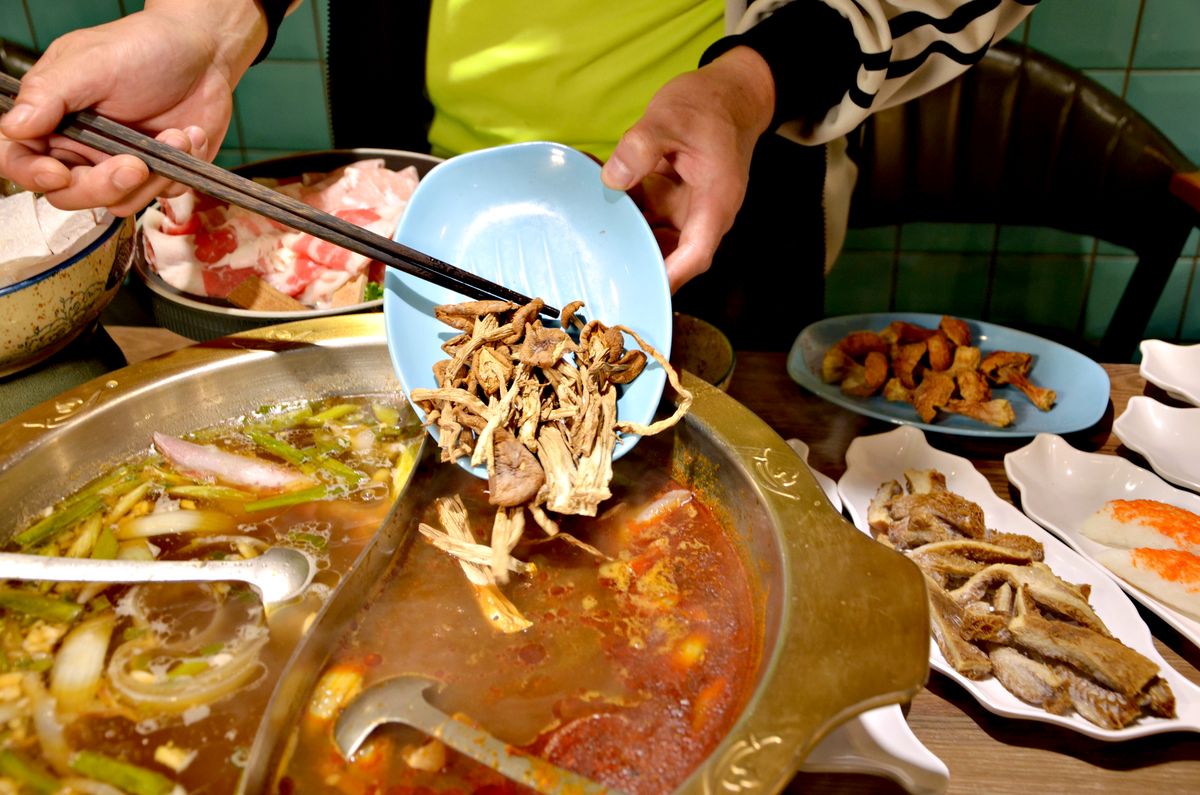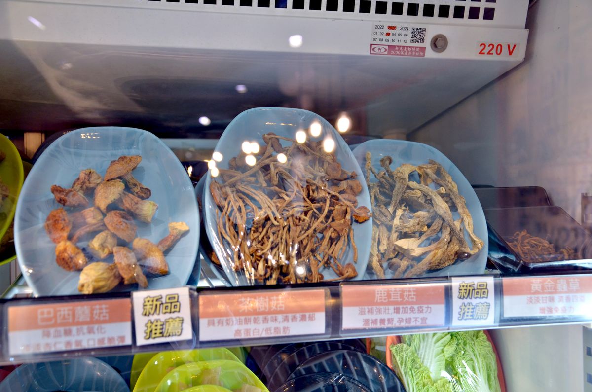 茶樹菇和巴西蘑菇兩種煮起來香味都很突出,特別是茶樹菇煮完會帶一點脆度,吃起來非常開胃。我們也很喜歡巴西蘑菇吃起來有種肉肉的口感,店裡還有鹿茸菇跟黃金蟲草,平常比較少在火鍋店看到這類的食材,菇菇這部分真的算店家有特色的食材。