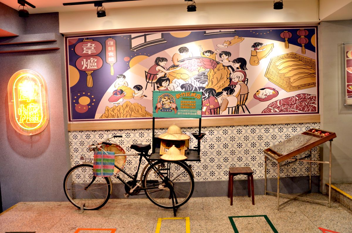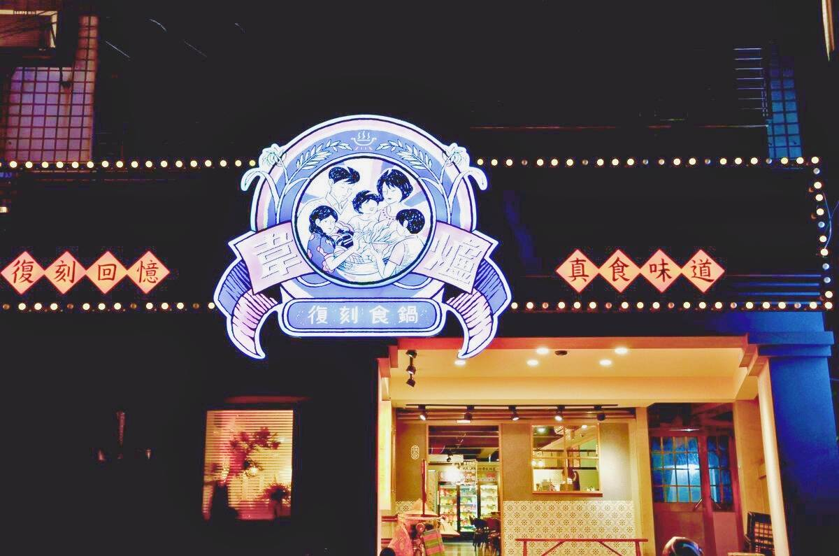 這次吃貨小隊來吃的 韋爐復刻食鍋巨城店,是那種路過會忍不住多看一眼的店,門口招牌復古霓虹燈、賣香腸的老式腳踏車、地上的跳格子,讓我想到小時候老電影院的氛圍,還沒進門就先喜歡上它的台式氛圍感。